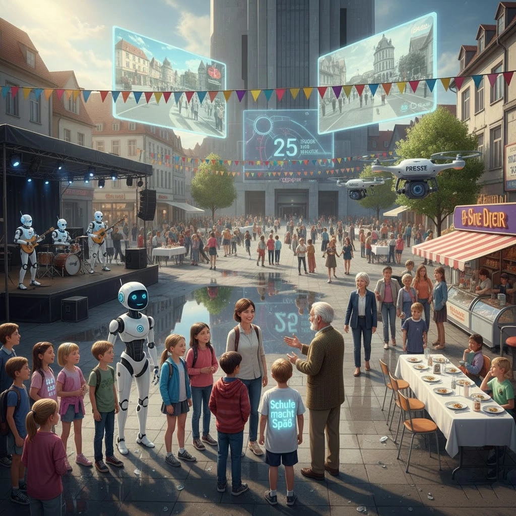 »Kommt, Kinder!« Wir folgten unserer Onlinelehrerin und Herrn Kranich und betraten den festlich geschmückten Marktplatz. Links von uns stand eine Bühne, auf der eine Roboterkapelle spielte. Ich kannte das Lied nicht, aber sicher war es so alt wie der Marktplatz selbst. An der Statue von Bürgermeister Kreye, der den Umbau des Marktplatzes in Auftrag gegeben hatte, blieben wir stehen. Kranich erzählte, wie Wagenfeld zur Großstadt geworden war und welchen Anteil der Bürgermeister und seine Nachfolgerin daran gehabt hatten.